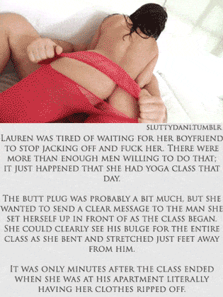 SLUTTYDANITUMBLR LAUREN WAS TIRED OF WAITING FOR HER BOYFRIEND TO STOP JACKING OFF AND FUCK HER. THERE WERE MORE THAN ENOUGH MEN WILLING TO DO THAT; IT JUST HAPPENED THAT SHE HAD YOGA CLASS THAT DAY, THE BUTT PLUG WAS PROBABLY A BIT MUCH, BUT SHE WANTED TO SEND A CLEAR MESSAGE TO THE MAN SHE SET HERSELF UP IN FRONT OF AS THE CLASS BEGAN. SHE COULD CLEARLY SEE HIS BULGE FOR THE ENTIRE CLASS AS SHE BENT AND STRETCHED JUST FEET AWAY FROM HIM. IT WAS ONLY MINUTES AFTER THE CLASS ENDED WHEN SHE WAS AT HIS APARTMENT LITERALLY HAVING HER CLOTHES RIPPED OFF.