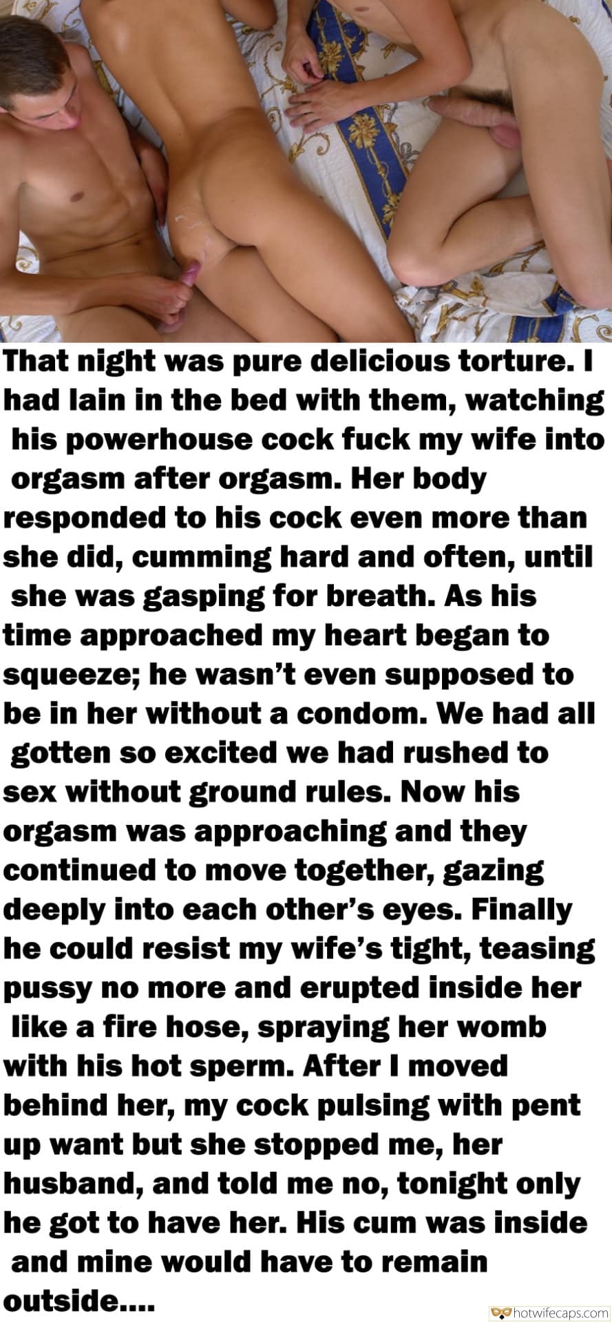 That night was pure delicious torture. I had lain in the bed with them, watching his powerhouse cock fuck my wife into orgasm after orgasm. Her body responded to his cock even more than she did, cumming hard and often, until she was gasping for breath. As his time approached my heart began to squeeze; he wasn’t even supposed to be in her without a condom. We had all gotten so excited we had rushed to sex without ground rules. Now his orgasm was approaching and they continued to move together, gazing deeply into each other’s eyes. Finally he could resist my wife’s tight, teasing pussy no more and erupted inside her like a fire hose, spraying her womb with his hot sperm. After I moved behind her, my cock pulsing with pent up want but she stopped me, her husband, and told me no, tonight only he got to have her. His cum was inside and mine would have to remain outside…
