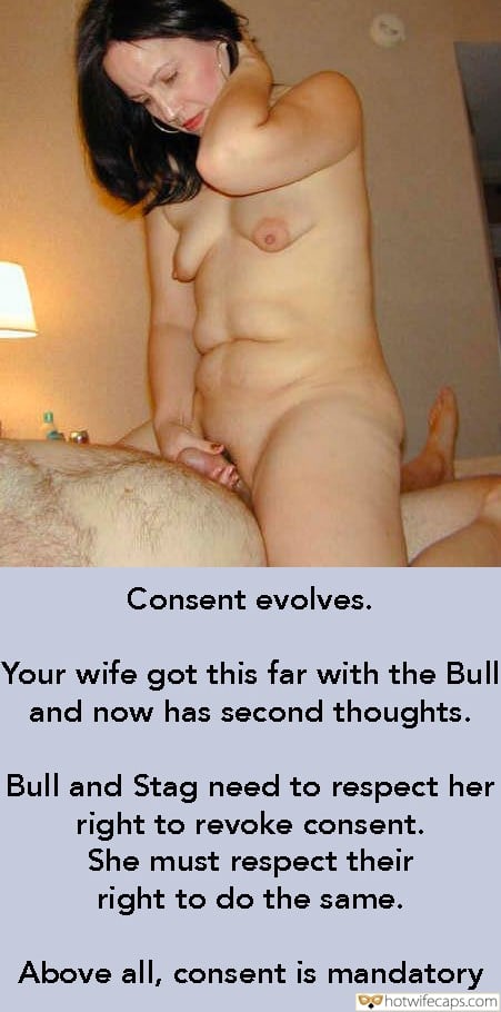 Consent evolves. Your wife got this far with the Bull and now has second thoughts. Bull and Stag need to respect her right to revoke consent. She must respect their right to do the same. Above all, consent is mandatory