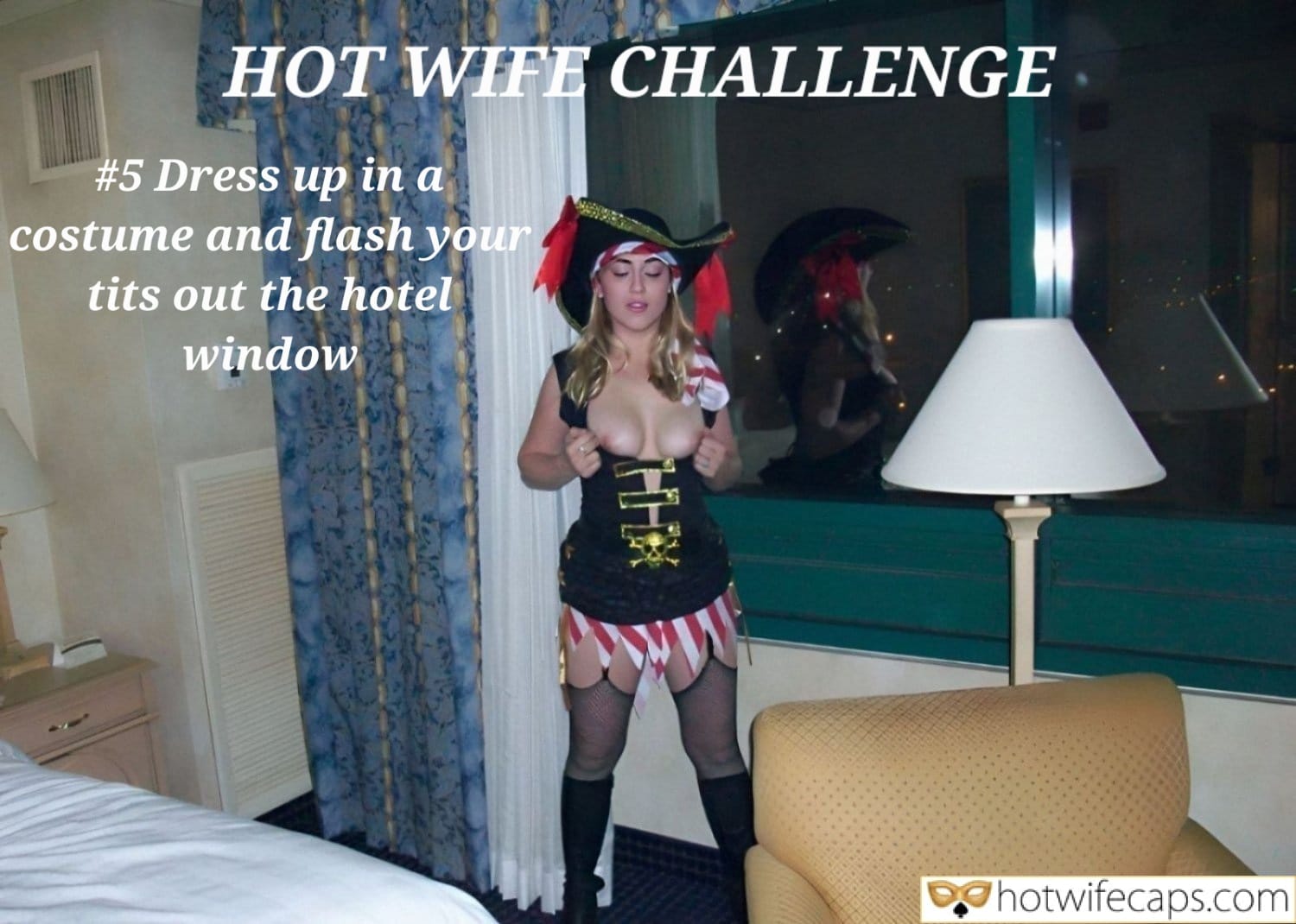 HOT WIFE CHALLENGE#5 Dress up in a costume and flash your tits out the hotel window.