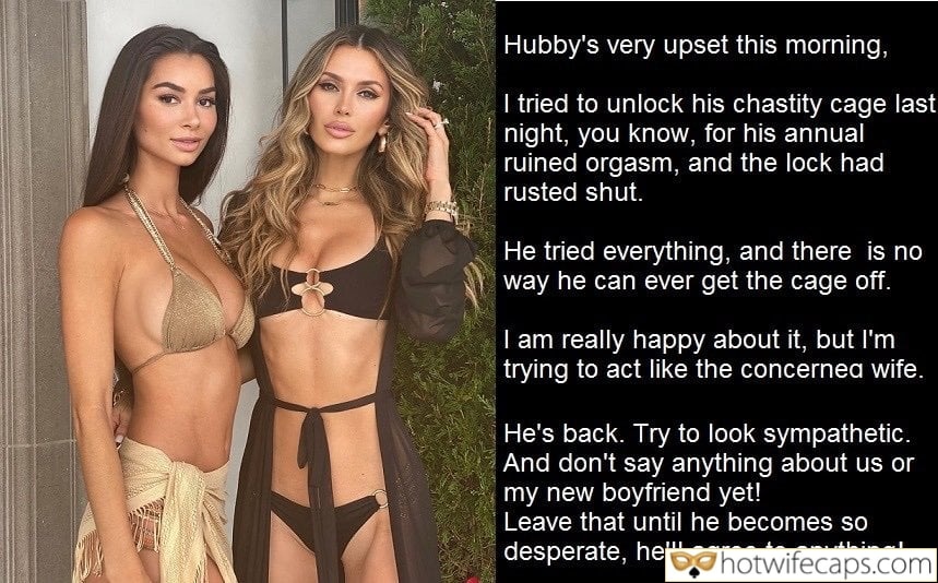 Hubby’s very upset this morning, I tried to unlock his chastity cage last night, you know, for his annual ruined orgasm, and the lock had rusted shut. He tried everything, and there is no way he can ever get the cage off. I am really happy about it, but I’m trying to act like the … Continue reading Two Girls Are Horny and Half Naked
