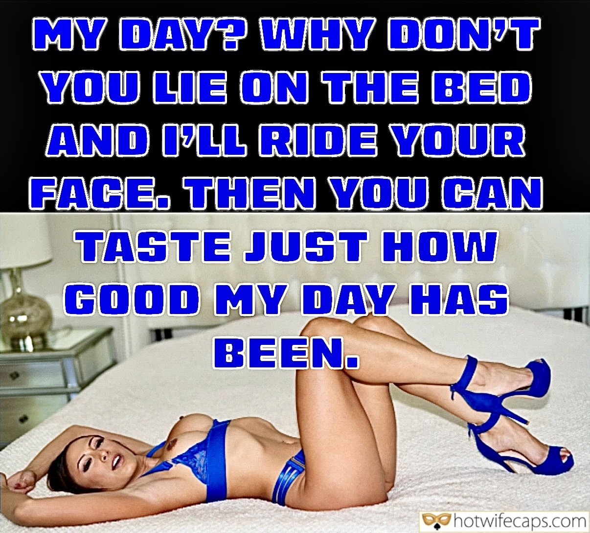 MY DAY? WHY DON’T YOU LIE ON THE BED AND I’LL RIDE YOUR FACE. THEN YOU CAN TASTE JUST HOW GOOD MY DAY HAS BEEN.