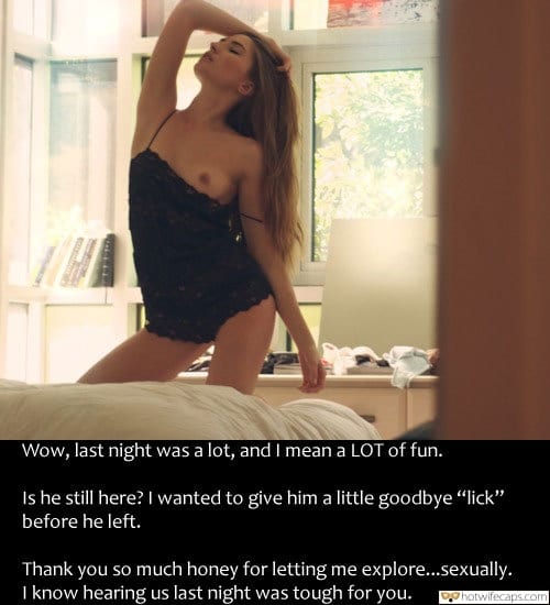 Wow, last night was a lot, and I mean a LOT of fun. Is he still here? I wanted to give him a little goodbye “lick” before he left. Thank you so much honey for letting me explore..sexually. I know hearing us last night was tough for you.