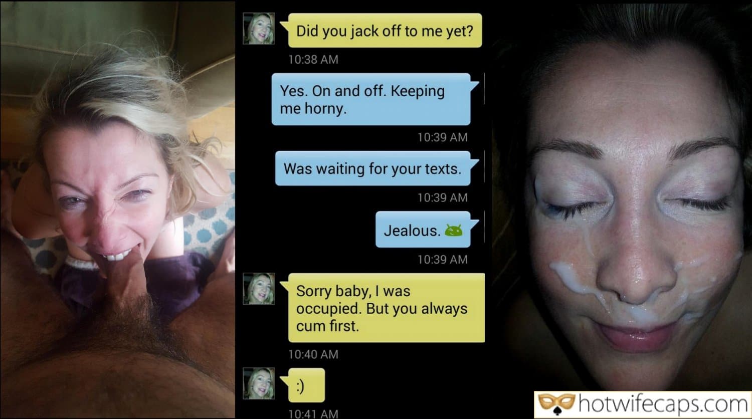 Did you jack off to me yet? 10:38 AM Yes. On and off. Keeping me horny. 10:39 AM Was waiting for your texts. 10:39 AM Jealous. 10:39 AM Sorry baby, I was occupied. But you always cum first. 10:40 AM 🙂 10:41 AM