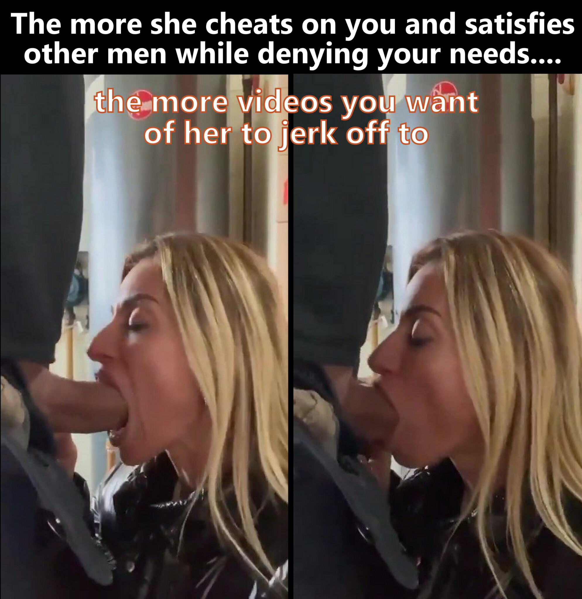 The more she cheats on you and satisfies other men while denying your needs…. the more videos you want of her to jerk off to.