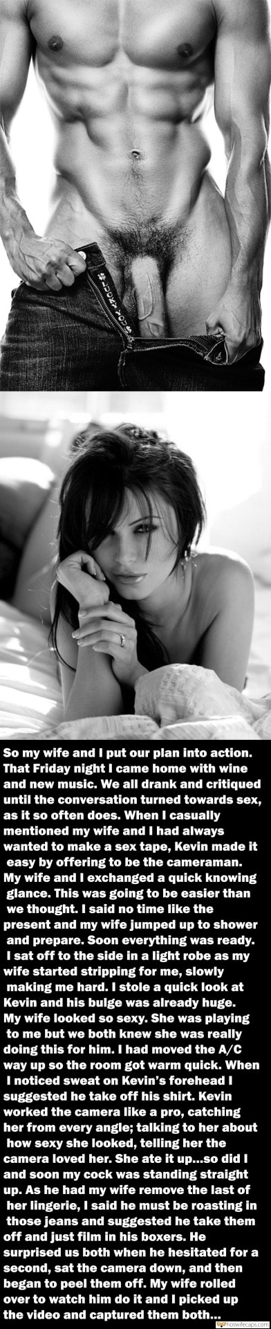 So my wife and I put our plan into action. That Friday night I came home with wine and new music. We all drank and critiqued until the conversation turned towards sex, as it so often does. When I casually mentioned my wife and I had always wanted to make a sex tape, Kevin made it easy by offering to be the cameraman. My wife and I exchanged a quick knowing glance. This was going to be easier than we thought. I said no time like the present and my wife jumped up to shower and prepare. Soon everything was ready. I sat off to the side in a light robe as my wife started stripping for me, slowly making me hard. I stole a quick look at Kevin and his bulge was already huge. My wife looked so sexy. She was playing to me but we both knew she was really doing this for him. I had moved the A/C way up so the room got warm quick. When I noticed sweat on Kevin’s forehead I suggested he take off his shirt. Kevin worked the camera like a pro, catching her from every angle; talking to her about how sexy she looked, telling her the camera loved her. She ate it up…so did I and soon my cock was standing straight up. As he had my wife remove the last of her lingerie, I said he must be roasting in those jeans and suggested he take them off and just film in his boxers. He surprised us both when he hesitated for a second, sat the camera down, and then began to peel them off. My wife rolled over to watch him do it and I picked up the video and captured them both…