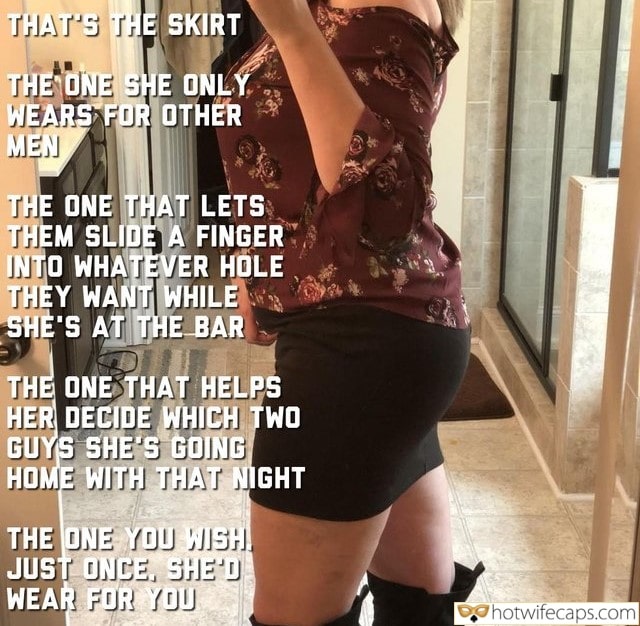 THAT’S THE SKIRT THE ONE SHE ONLY WEARS FOR OTHER MEN THE ONE THAT LETS THEM SLIDE A FINGER INTO WHATEVER HOLE THEY WANT WHILE SHE’S AT THE BAR THE ONE THAT HELPS HER DECIDE WHICH TWO GUYS SHE’S GOING HOME WITH THAT NIGHT THE ONE YOU WISH! JUST ONCE, SHE’D WEAR FOR YOU