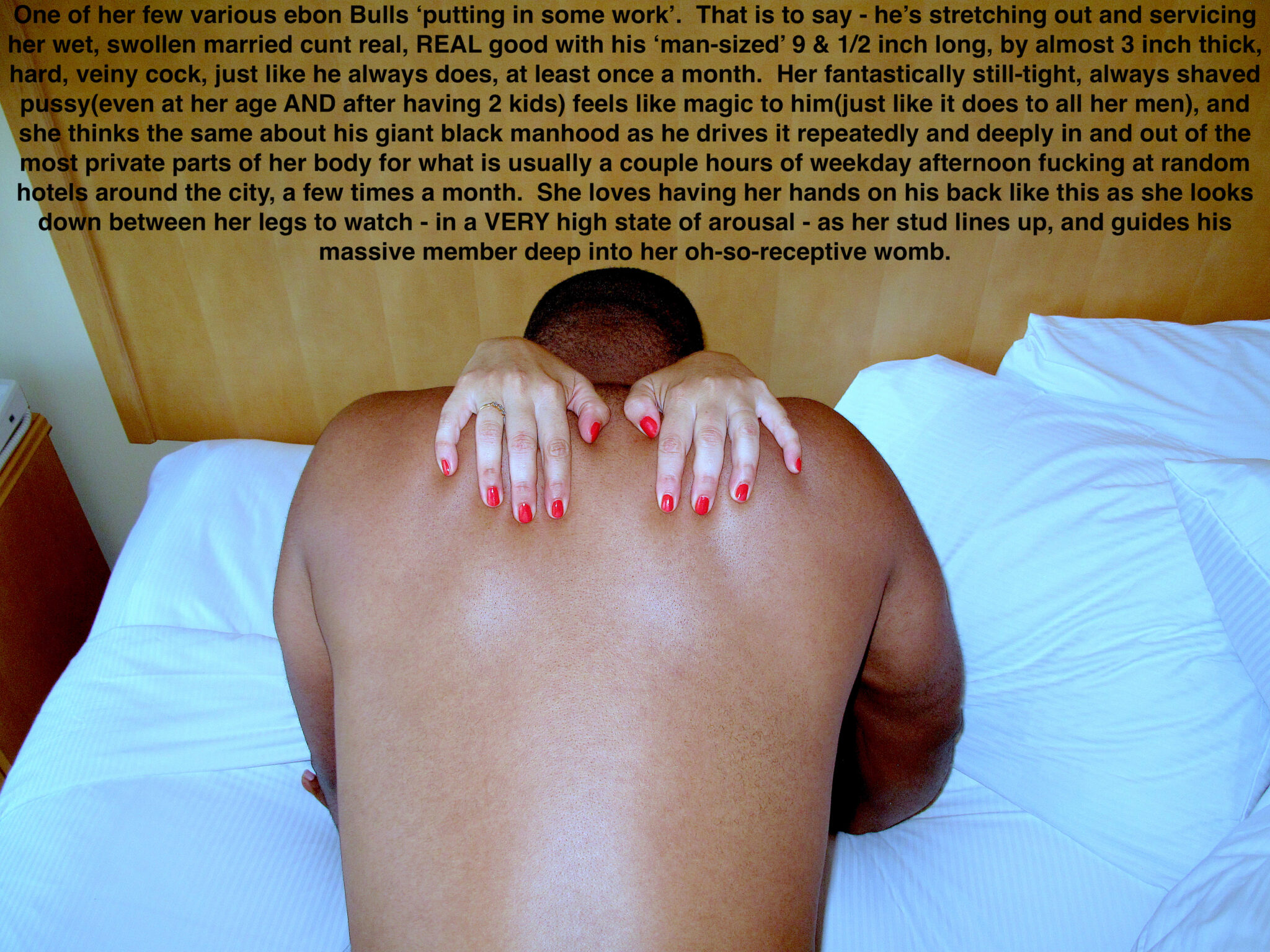 One of her few various ebon Bulls ‘putting in some work’. That is to say – he’s stretching out and servicing her wet, swollen married cunt real, REAL good with his ‘man-sized’ 9 & 1/2 inch long, by almost 3 inch thick, hard, veiny cock, just like he always does, at least once a month. … Continue reading Hot Sex With a New Bull