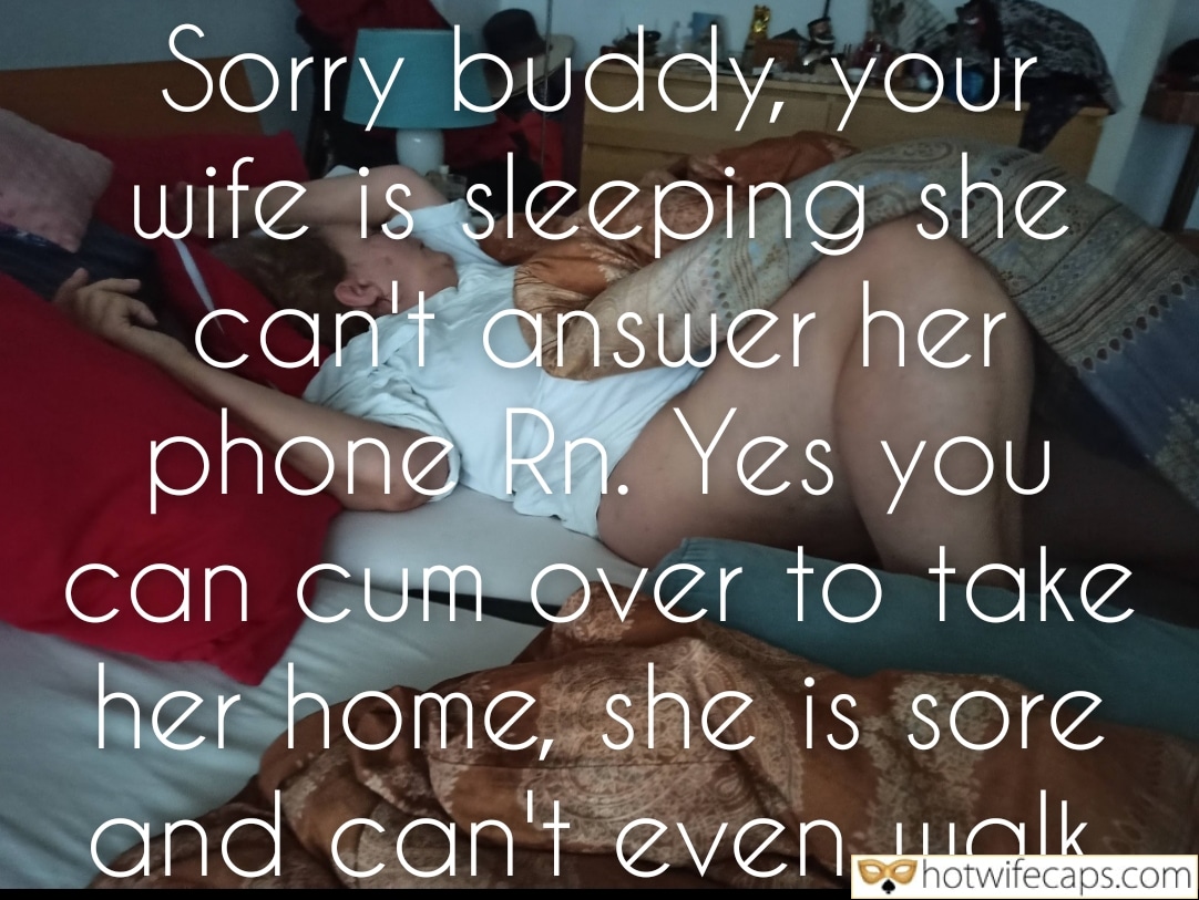Bedroom scene shows a woman recovering after intense sexual activity, unable to walk due to soreness. Text overlay indicates her husband is coming to take he…