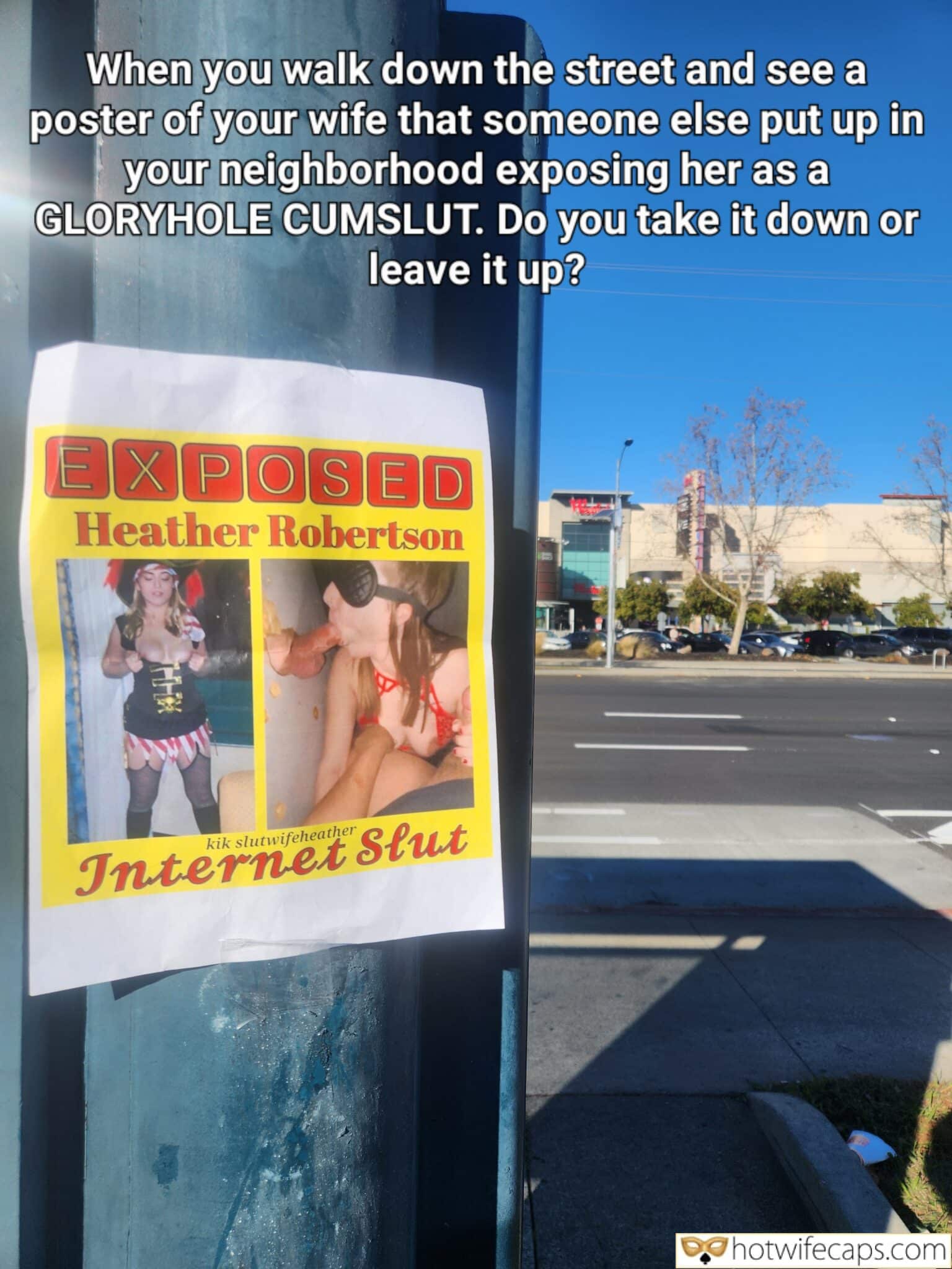When you walk down the street and see a poster of your wife that someone else put up in your neighborhood exposing her as a GLORYHOLE CUMSLUT. Do you take it down or leave it up?